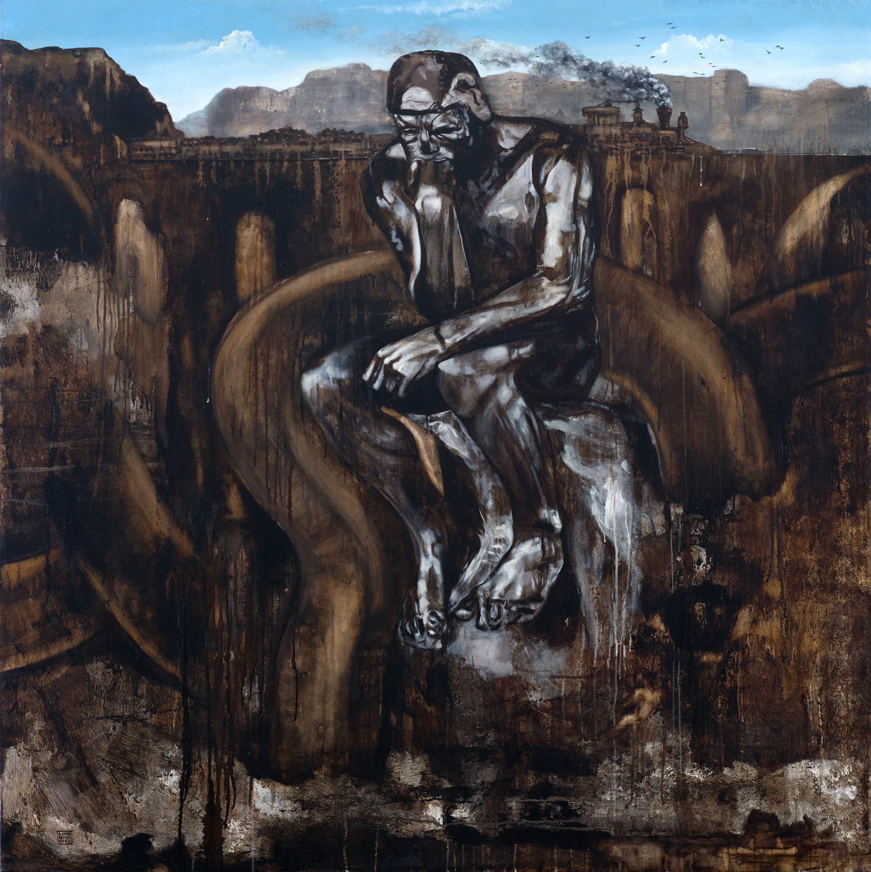 The Thinker merupakan arca ikonik yang dihasilkan oleh seniman Perancis, Auguste Rodin. Diilhamkan daripada bahagian Inferno dalam puisi Divine Comedy oleh Dante, figura dalam keadaan termenung ini pada asalnya dibayangkan duduk di atas Pintu Neraka sambil memerhati dan merenung orang-orang yang diseksa di bawah. Dalam karya lukisan ini, Ahmad Fuad memaparkan figura misteri tersebut dengan latar belakang yang luas, gelap dan menggerunkan, sambil sebuah kilang mengeluarkan asap toksik yang tebal. Cat bitumen amat sesuai dipakai untuk karya ini kerana ia digunakan secara meluas sebagai bahan penebat cuaca di kilang atau tapak binaan. Latar belakang yang kelam dan suram meliputi hampir keseluruhan kanvas, dengan jalur-jalur titisan cat yang berbeza-beza menimbulkan kesan seakan kikisan dan hakisan. Sementara itu, sejalur langit cerah terbentang di atas kaki langit di kejauhan. Figura itu duduk di tengah-tengah lukisan yang serba mengganggu ini, seolah-olah bersemuka dengan penonton seraya memikirkan peranan yang mereka mainkan berhubung dengan kemusnahan yang berlaku pada masa kini akibat tindakan dan perbuatan manusia.