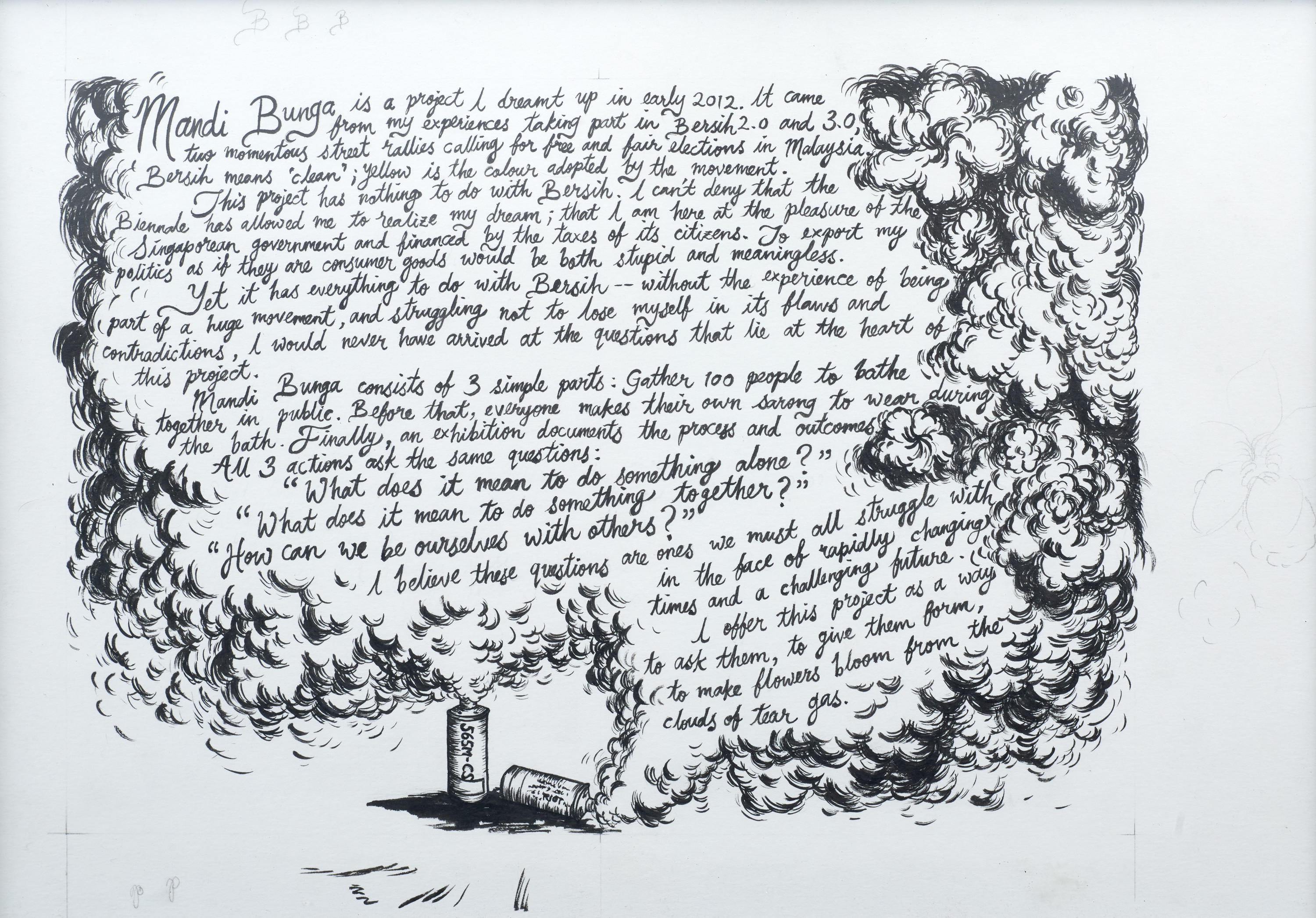 Projek ‘Mandi Bunga’ ini diilham oleh pengalaman Sharon Chin menyertai perhimpunan jalanan Bersih 2.0 dan Bersih 3.0 yang menggesa pilihan raya bebas dan adil di Malaysia. Apa yang dia lukiskan bukanlah insiden protes itu sendiri tetapi pengalaman menjadi sebahagian daripada pergerakan besar, dan pergelutan dirinya untuk tidak kehilangan diri dalam kelemahan dan kecanggahannya. Yang dimaksudkan dengan kecanggahan ialah hakikat projeknya yang dibiayai oleh penganjur Biennale, atau dalam kata lain, kerajaan Singapura dan rakyatnya. Pengalaman beliau diterjemahkan ke Mandi Bunga dalam tiga bahagian: pertama, lebih seratus orang telah dijemput untuk membawa atau membuat kain sarung mereka sendiri untuk dipakai semasa mandi bunga awam itu; persembahan sepuluh minit mandi beramai-ramai diadakan di perkarangan Muzium Nasional Singapura; akhir sekali, sebuah pameran dokumentasi proses dan hasil persembahan telah diadakan. Dengan membuat orang yang tidak dikenalinya bermandi bunga di khalayak awam, Sharon Chin berhasrat mempertimbangkan tiga soalan: Apakah yang dimaksudkan dengan melakukan sesuatu secara bersendirian? Apakah yang dimaksudkan dengan melakukan sesuatu bersama? Dan bagaimana kita jadi kita sendiri bersama orang lain?